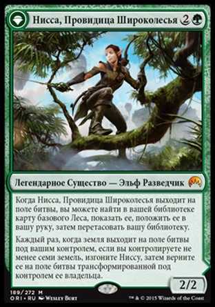 | Card Text | When Nissa, Vastwood Seer enters the battlefield, you may search your library for a basic Forest card, reveal it, put it into your hand, then shuffle your library. Whenever a land enters the battlefield under your control, if you control seven or more lands, exile Nissa, then return her to the battlefield transformed under her owner s control. |
