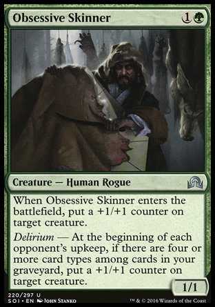 | Card Text | When Obsessive Skinner enters the battlefield, put a +1/+1 counter on target creature. Delirium — At the beginning of each opponent's upkeep, if there are four or more card types among cards in your graveyard, put a +1/+1 counter on target creature. |