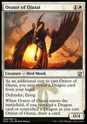 | Card Text | As an additional cost to cast Orator of Ojutai, you may reveal a Dragon card from your hand. Defender, flying When Orator of Ojutai enters the battlefield, if you revealed a Dragon card or controlled a Dragon as you cast Orator of Ojutai, draw a card. |