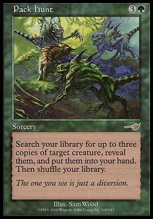 Card TextSearch your library for up to three cards with the same name as target creature, reveal them, and put them into your hand. Then shuffle your library.