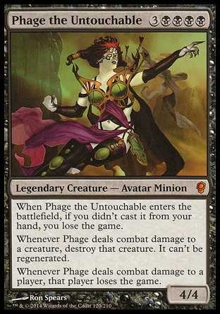 Card TextWhen Phage the Untouchable enters the battlefield, if you didn t cast it from your hand, you lose the game. Whenever Phage deals combat damage to a creature, destroy that creature. It can t be regenerated. Whenever Phage deals combat damage to a player, that player loses the game.