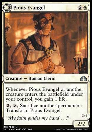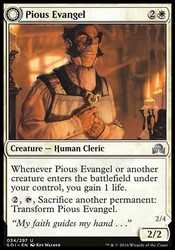 | Card Text | Whenever Pious Evangel or another creature enters the battlefield under your control, you gain 1 life. {2}, {T}, Sacrifice another permanent: Transform Pious Evangel. |