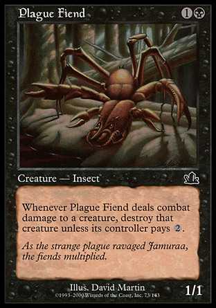 Card TextWhenever Plague Fiend deals combat damage to a creature, destroy that creature unless its controller pays {2}.
