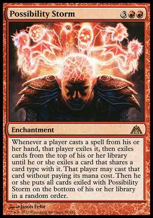 | Card Text | Whenever a player casts a spell from his or her hand, that player exiles it, then exiles cards from the top of his or her library until he or she exiles a card that shares a card type with it. That player may cast that card without paying its mana cost. Then he or she puts all cards exiled with Possibility Storm on the bottom of his or her library in a random order. |