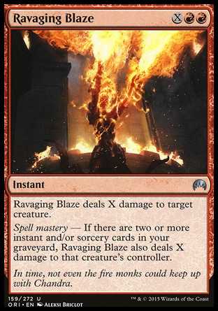 | Card Text | Ravaging Blaze deals X damage to target creature. Spell mastery — If there are two or more instant and/or sorcery cards in your graveyard, Ravaging Blaze also deals X damage to that creature s controller. |