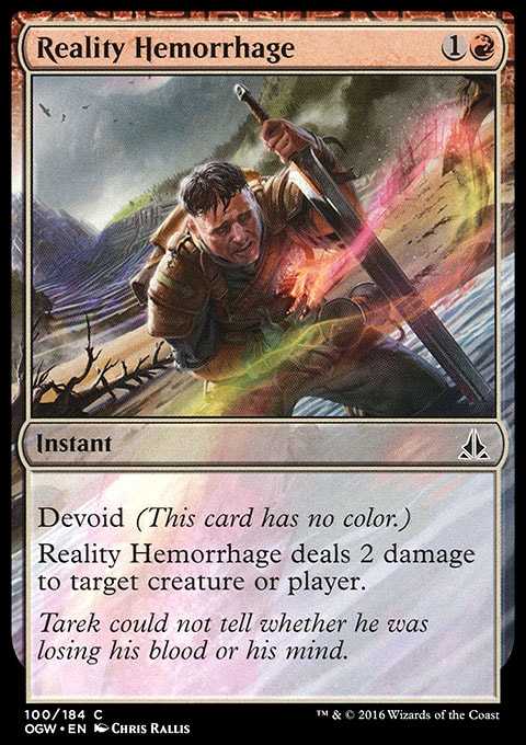 | Card Text | Devoid (This card has no color.) Reality Hemorrhage deals 2 damage to target creature or player. |