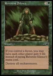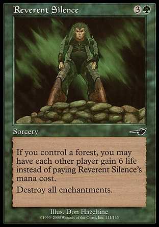 | Card Text | If you control a Forest, rather than pay Reverent Silence s mana cost, you may have each other player gain 6 life. Destroy all enchantments. |