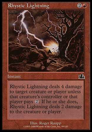 | Card Text | Rhystic Lightning deals 4 damage to target creature or player unless that creature s controller or that player pays {2}. If he or she does, Rhystic Lightning deals 2 damage to the creature or player. |