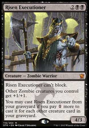 | Card Text | Risen Executioner can t block. Other Zombie creatures you control get +1/+1. You may cast Risen Executioner from your graveyard if you pay {1} more to cast it for each other creature card in your graveyard. |