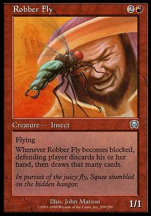 Card TextFlying Whenever Robber Fly becomes blocked, defending player discards all the cards in his or her hand, then draws that many cards.