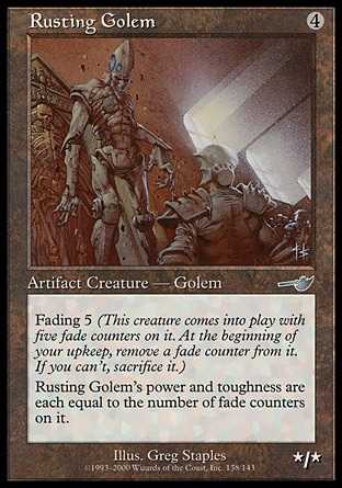 Card TextFading 5 (This creature enters the battlefield with five fade counters on it. At the beginning of your upkeep, remove a fade counter from it. If you can t, sacrifice it.) Rusting Golem s power and toughness are each equal to the number of fade counters on it.