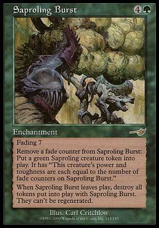 | Card Text | Fading 7 (This enchantment enters the battlefield with seven fade counters on it. At the beginning of your upkeep, remove a fade counter from it. If you can t, sacrifice it.) Remove a fade counter from Saproling Burst: Put a green Saproling creature token onto the battlefield. It has "This creature s power and toughness are each equal to the number of fade counters on Saproling Burst." When Saproling Burst leaves the battlefield, destroy all tokens put onto the battlefield with Saproling Burst. They can t be regenerated. |