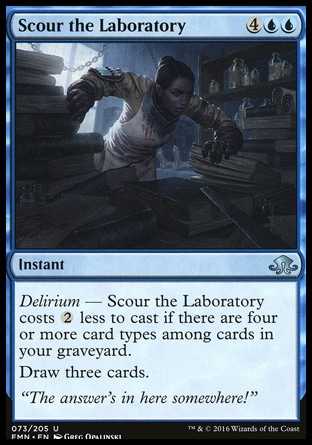 | Card Text | Delirium — Scour the Laboratory costs {2} less to cast if there are four or more card types among cards in your graveyard. Draw three cards. |
