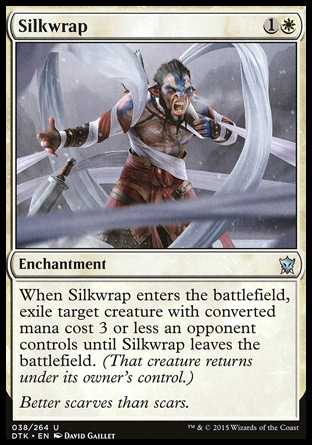 | Card Text | When Silkwrap enters the battlefield, exile target creature with converted mana cost 3 or less an opponent controls until Silkwrap leaves the battlefield. (That creature returns under its owner s control.) |