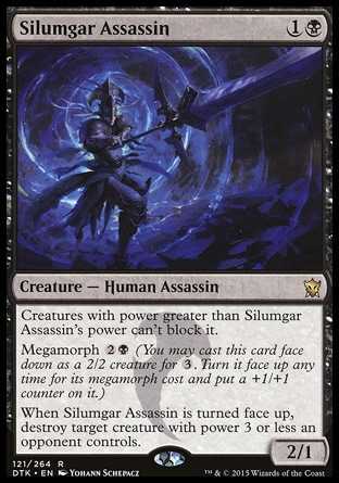 | Card Text | Creatures with power greater than Silumgar Assassin s power can t block it. Megamorph {2}{B} (You may cast this card face down as a 2/2 creature for {3}. Turn it face up any time for its megamorph cost and put a +1/+1 counter on it.) When Silumgar Assassin is turned face up, destroy target creature with power 3 or less an opponent controls. |
