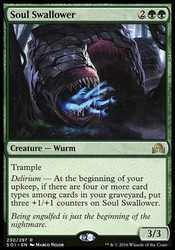 | Card Text | Trample Delirium — At the beginning of your upkeep, if there are four or more card types among cards in your graveyard, put three +1/+1 counters on Soul Swallower. |