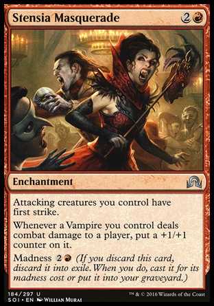 | Card Text | Attacking creatures you control have first strike. Whenever a Vampire you control deals combat damage to a player, put a +1/+1 counter on it. Madness {2}{R} (If you discard this card, discard it into exile. When you do, cast it for its madness cost or put it into your graveyard.) |