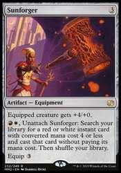 | Card Text | Equipped creature gets +4/+0. {R}{W}, Unattach Sunforger: Search your library for a red or white instant card with converted mana cost 4 or less and cast that card without paying its mana cost. Then shuffle your library. Equip {3} |