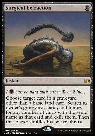 Card Text({B/P} can be paid with either {B} or 2 life.) Choose target card in a graveyard other than a basic land card. Search its owner s graveyard, hand, and library for any number of cards with the same name as that card and exile them. Then that player shuffles his or her library.