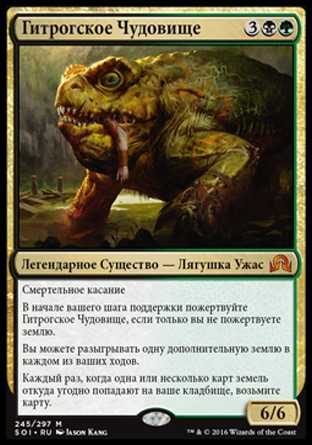 | Card Text | Deathtouch At the beginning of your upkeep, sacrifice The Gitrog Monster unless you sacrifice a land. You may play an additional land on each of your turns. Whenever one or more land cards are put into your graveyard from anywhere, draw a card. |