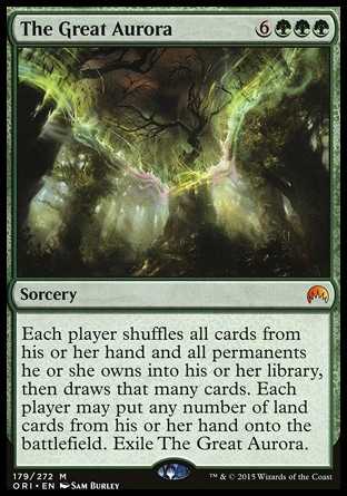 | Card Text | Each player shuffles all cards from his or her hand and all permanents he or she owns into his or her library, then draws that many cards. Each player may put any number of land cards from his or her hand onto the battlefield. Exile The Great Aurora. |