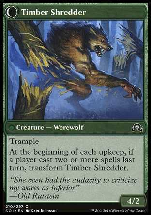 At the beginning of each upkeep, if a player cast two or more spells last turn, transform Timber Shredder.