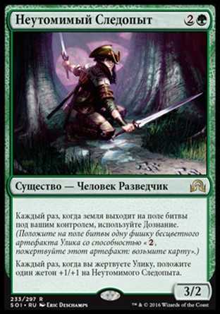 | Card Text | Whenever a land enters the battlefield under your control, investigate. (Put a colorless Clue artifact token onto the battlefield with "{2}, Sacrifice this artifact: Draw a card.") Whenever you sacrifice a Clue, put a +1/+1 counter on Tireless Tracker. |