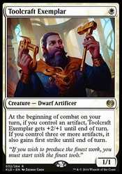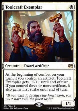 Card TextAt the beginning of combat on your turn, if you control an artifact, Toolcraft Exemplar gets +2/+1 until end of turn. If you control three or more artifacts, it also gains first strike until end of turn.
