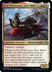 | Card Text | Vigilance, trample Whenever Tori D'Avenant, Fury Rider attacks, all other attacking creatures you control get +1/+1 until end of turn. Other red attacking creatures you control gain trample until end of turn. Untap each other white attacking creature you control. |