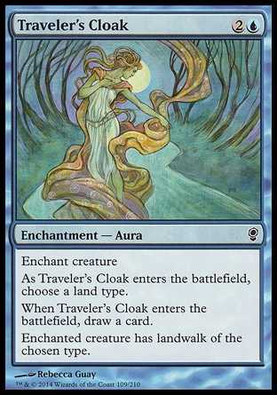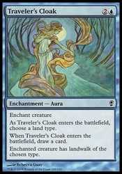 | Card Text | Enchant creature As Traveler s Cloak enters the battlefield, choose a land type. When Traveler s Cloak enters the battlefield, draw a card. Enchanted creature has landwalk of the chosen type. (It can t be blocked as long as defending player controls a land of that type.) |