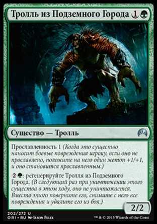 | Card Text | Renown 1 (When this creature deals combat damage to a player, if it isn t renowned, put a +1/+1 counter on it and it becomes renowned.) {2}{G}: Regenerate Undercity Troll. (The next time this creature would be destroyed this turn, it isn t. Instead tap it, remove all damage from it, and remove it from combat.) |