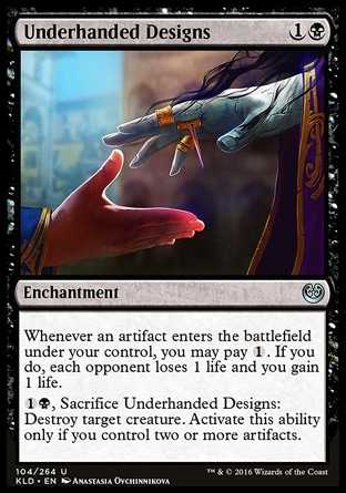 | Card Text | Whenever an artifact enters the battlefield under your control, you may pay {1}. If you do, each opponent loses 1 life and you gain 1 life. {1}{B}, Sacrifice Underhanded Designs: Destroy target creature. Activate this ability only if you control two or more artifacts. |