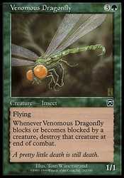 Card TextFlying Whenever Venomous Dragonfly blocks or becomes blocked by a creature, destroy that creature at end of combat.