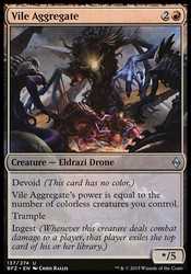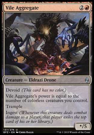 | Card Text | Devoid (This card has no color.) Vile Aggregate's power is equal to the number of colorless creatures you control. Trample Ingest (Whenever this creature deals combat damage to a player, that player exiles the top card of his or her library.) |