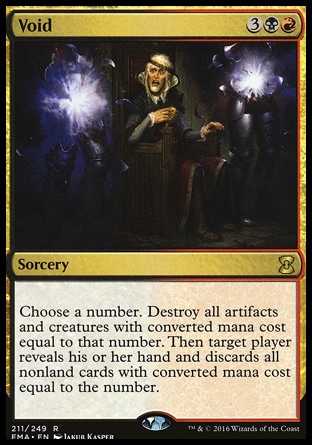 | Card Text | Choose a number. Destroy all artifacts and creatures with converted mana cost equal to that number. Then target player reveals his or her hand and discards all nonland cards with converted mana cost equal to the number. |
