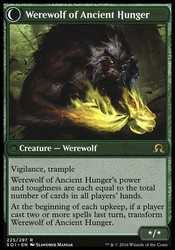 | Card Text | Vigilance, trample Werewolf of Ancient Hunger's power and toughness are each equal to the total number of cards in all players' hands. At the beginning of each upkeep, if a player cast two or more spells last turn, transform Werewolf of Ancient Hunger. |