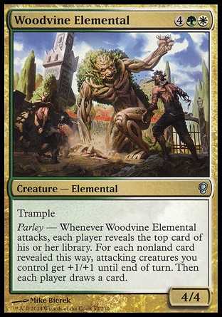 | Card Text | Trample Parley — Whenever Woodvine Elemental attacks, each player reveals the top card of his or her library. For each nonland card revealed this way, attacking creatures you control get +1/+1 until end of turn. Then each player draws a card. |