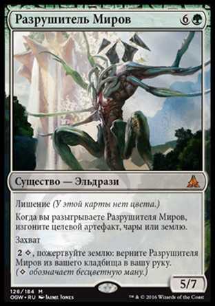 | Card Text | Devoid (This card has no color.) When you cast World Breaker, exile target artifact, enchantment, or land. Reach {2}{C}, Sacrifice a land: Return World Breaker from your graveyard to your hand. ({C} represents colorless mana.) |