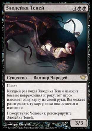 | Card Text | Flying Whenever Fiend of the Shadows deals combat damage to a player, that player exiles a card from his or her hand. You may play that card for as long as it remains exiled. Sacrifice a Human: Regenerate Fiend of the Shadows. |