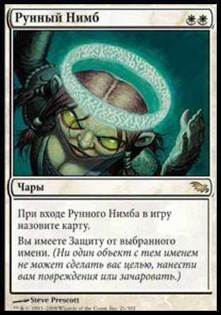 | Card Text | As Runed Halo enters the battlefield, name a card. You have protection from the chosen name. (You can"t be targeted, dealt damage, or enchanted by anything with that name.) |