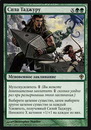| Card Text | Multikicker (You may pay an additional any number of times as you cast this spell.)Choose target creature, then choose another target creature for each time Strength of the Tajuru was kicked. Put X +1/+1 counters on each of them. |