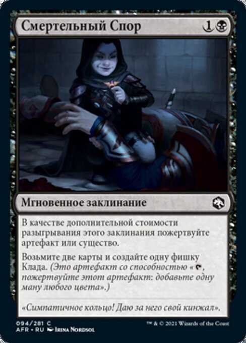 | Card Text | As an additional cost to cast this spell, sacrifice an artifact or creature. Draw two cards and create a Treasure token. (It's an artifact with " |