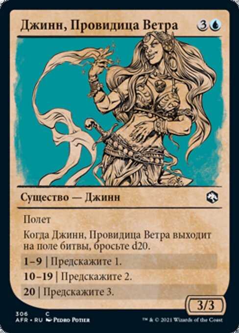 | Card Text | Flying When Djinni Windseer enters the battlefield, roll a d20. 1—9 | Scry 1. 10—19 | Scry 2. 20 | Scry 3. |