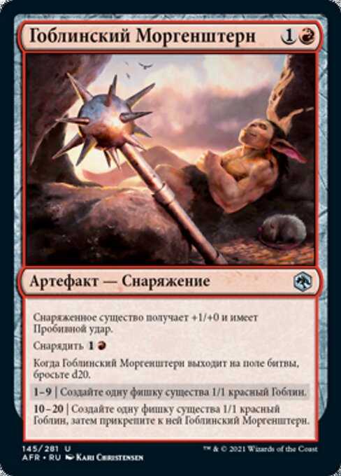 | Card Text | Equipped creature gets +1/+0 and has trample. Equip When Goblin Morningstar enters the battlefield, roll a d20. 1—9 | Create a 1/1 red Goblin creature token. 10—20 | Create a 1/1 red Goblin creature token, then attach Goblin Morningstar to it. |