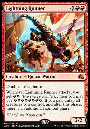 | Card Text | Double strike, haste Whenever Lightning Runner attacks, you get {E}{E} (two energy counters), then you may pay {E}{E}{E}{E}{E}{E}{E}{E}. If you pay, untap all creatures you control, and after this phase, there is an additional combat phase. |