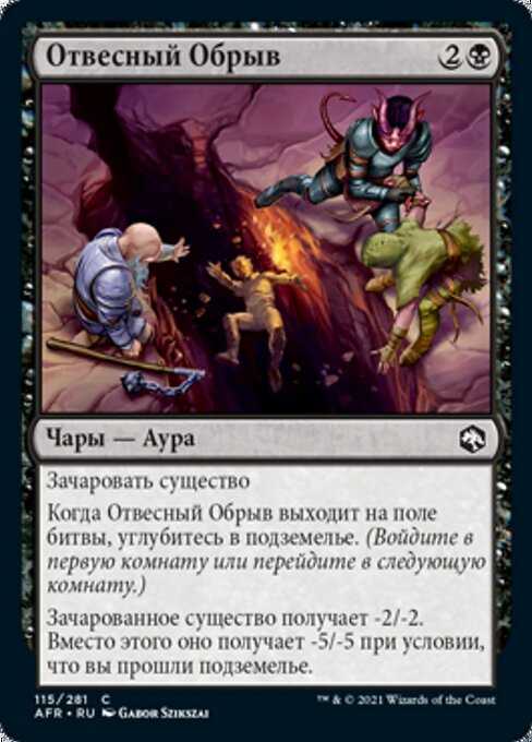 | Card Text | Enchant creature When Precipitous Drop enters the battlefield, venture into the dungeon. (Enter the first room or advance to the next room.) Enchanted creature gets -2/-2. It gets -5/-5 instead as long as you've completed a dungeon. |