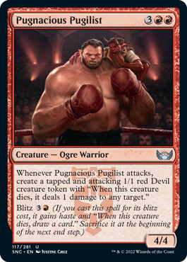 | Card Text | Whenever Pugnacious Pugilist attacks, create a tapped and attacking 1/1 red Devil creature token with "When this creature dies, it deals 1 damage to any target." Blitz |