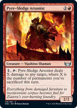 | Card Text | , : pyre-sledge arsonist deals x damage to any target, where x is the number of permanents you've sacrificed this turn. |