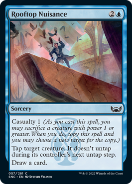| Card Text | Casualty 1 (As you cast this spell, you may sacrifice a creature with power 1 or greater. When you do, copy this spell and you may choose a new target for the copy.) Tap target creature. It doesn't untap during its controller's next untap step. Draw a card. |