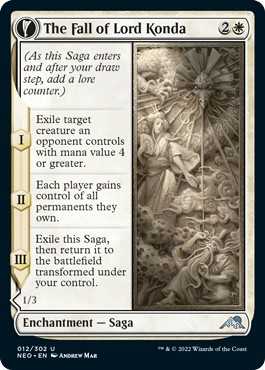 | Card Text | (As this Saga enters and after your draw step, add a lore counter.) I — Exile target creature an opponent controls with mana value 4 or greater. II — Each player gains control of all permanents they own. III — Exile this Saga, then return it to the battlefield transformed under your control. |